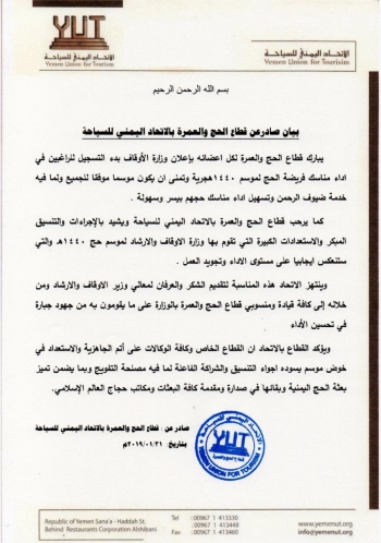 الاتحاد اليمني للسياحة يرحب بإعلان وزارة الأوقاف عن تدشين موسم حج...