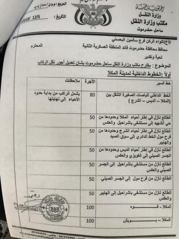 مكتب النقل يصدر تعميماً بالتعرفة الجديدة لجميع فرزات ساحل حضرموت...