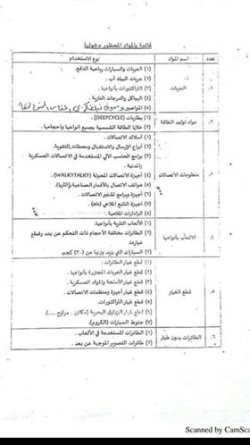 وطبقا للوثائق فإن القائمة تضمنت حظر ب السيارات رباعية الدفع وعربات البيك اب وجنوط السيارات المصنوعة من الكروم، والدراجات النارية والمائية ومواد كيميائية وبطاريات وألواح توليد الطاقة الشمسية وقطع غيار المعدات الثقيلة، ومعدات الغطس والأنابيب المعدنية والملابس العسكرية وأجهزة وبرامج الاتصالات العسكرية والمدنية.