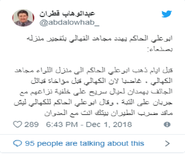 وقال إنه ابو علي الحاكم ذهب قبل أيام إلى منزل اللواء مجاهد القهالي عاضباً لأنه القهالي قبل مؤاخاة قبائل الجائف بهمدان لعيال سريح على خلفية نزاعهم مع جربان على التبة ، وقال ابوعلي الحاكم للكهالي ليش ماقد ضرب الطيران بيتك انت مع العدوان.