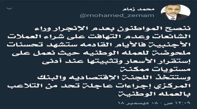 حذر محافظ البنك المركزي اليمني بعدن الدكتور محمد إمام المواطنين عدم الإنجرار وراء الشائعات و التهافت على شراء العملات الأجنبية .
