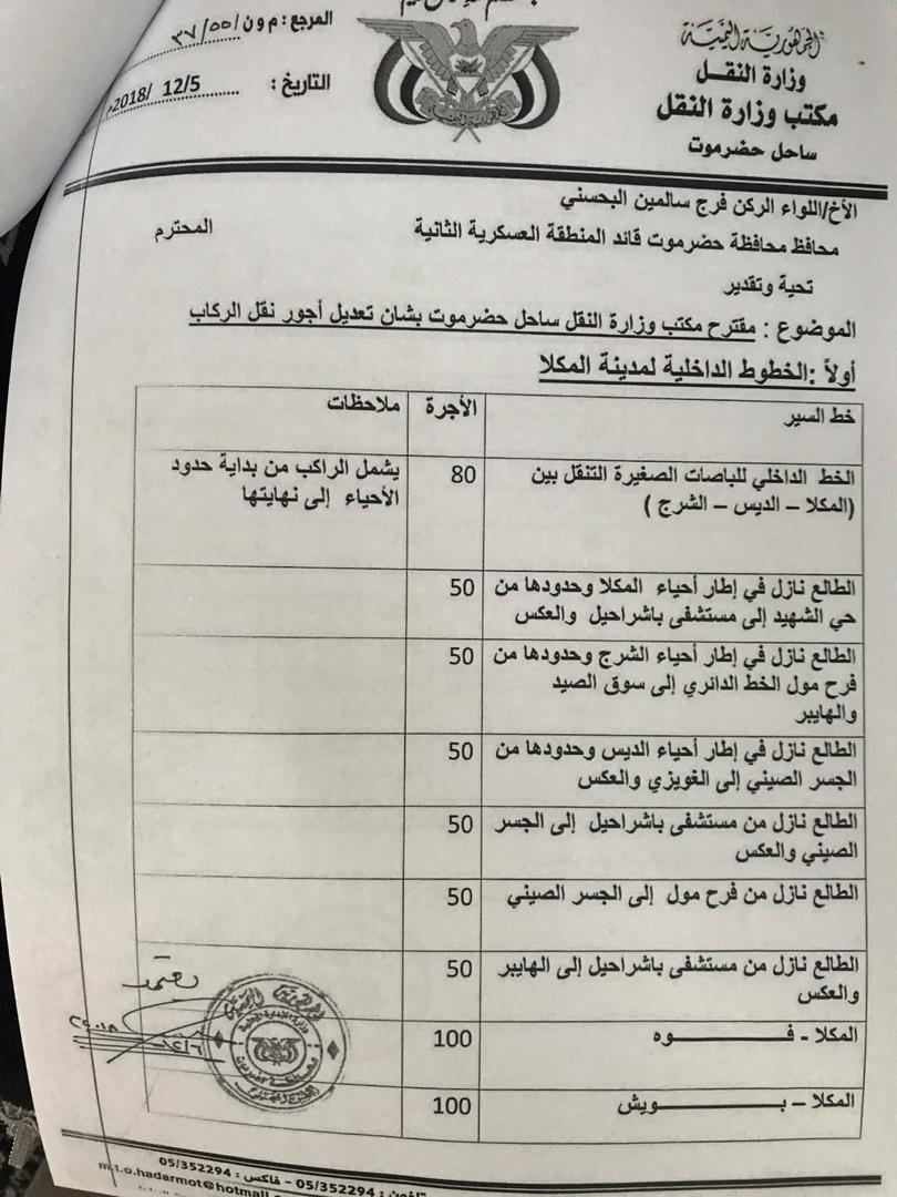 أصدر مكتب وزارة النقل بساحل حضرموت تعميماً بالأسعار الجديدة لتعرفة أجرة نقل الركاب في جميع فرزات ساحل حضرموت .
