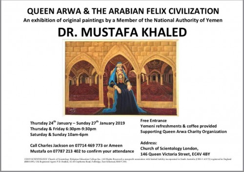 ينظم عضو الهيئة الوطنية ورئيس الملتقى الثقافي في العاصمة البريطانية لندن، اليمني مصطفى خالد، المعرض التشكيلي الأول من نوعه، تحت شعار "الملكة أروى والحضارة العربية السعيدة". وسيستمر المعرض من 24 يناير الجاري، وحتى 27 من الشهر ذاته. ودعا الدكتور مصطفى خالد، الوافدين والسياسين والمثقفين من مختلف التوجهات لمشاركة هذا الحدث الهام. وسيتم عرض أكثر من ثلاثين لوحة أصلية عملاقة، تخلد التراث و الحضارة العربية السعيدة في العصور المتلاحقة. ويتخلل المعرض عرض تلفزيوني ومحاضرات تحاكي و توثق الموضوع ذاته، كما يتضمن ركناً للأزياء والمشغولات اليدوية والحلي الجميلة المتوارثة في هذة المنطقة المتميزة من العالم بجمالها وتنوعها الثقافي الفريد. ولن يخلو المعرض من متعة تذوق القهوة اليمنية الفاخرة مع التمر، ووجبات خفيفة للزوار كمتعة مجانية في رحاب السعيدة بضيافة أروى ملكة العرب، عمق التاريخ الموغل في القدم وحضارة البن والبخور.