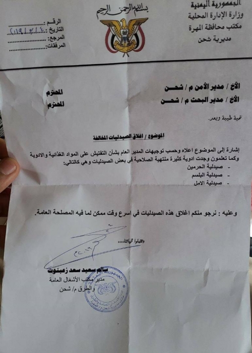 قررت الأجهزة الأمنية بمديرية شحن الحدودية بمحافظة المهرة ، مساء اليوم الإثنين ، إغلاق ثلاث صيدليات، لمخالفتها قانون المهنة ، بعد ضبط كميات كبيرة من الأدوية منتهية الصلاحية. يأتي ذلك على خلفية حملة التفتيش المشتركة التي انطلقت قبل أيام برعاية الشيخ راجح سعيد باكريت محافظ المهرة ،و نفذها مكتبي الصحة والأشغال العامة بالمديرية بالتنسيق مع الأجهزة الأمنية بناء على توجيهات مدير عام شحن الشيخ محمد بن محمد زعبنوت . وكشف النقيب رشيد الصلاحي مدير إدارة البحث الجنائى بالمديرية ،عن أسماء الصيدليات المغلقة وهي (الحرمين ،والبلسم والأمل)، مؤكداً أنه سيتم استكمال الإجراءات القانونية تمهيداً لإحالة أصحابها إلى الأجهزة القضائية. وأشار النقيب الصلاحي، أنه تم إغلاق الصيدليات، تنفيذا لتوجيهات قيادة السلطة المحلية وقيادة الحملة المشتركة، ممثلة بمدير مكتب الأشغال سالم سعيد زعبنوت والقائم بأعمال مدير مكتب الصحة الدكتور خيران هادي محمد . على صعيد أخر ، عبر مواطنون من مديرية شحن عن ارتياحهم الكبير بما تحققه هذه الحملات من نتائج مميزة وخاصة في مجال الغش والتلاعب في الأدوية والمواد الغذائية الاستهلاكية التي تمس حياة المواطن بشكل مباشر. واعتبر المواطنون ، أن هذه الصيدليات تقوم بخيانة أمانة المهنة والضمير والأخلاق الإنسانية ، مطالبين بضرورة اتخاذ الإجراءات القانونية اللازمة وعدم التهاون في معاقبتهم. كما عبر مواطنون من شحن، عن شكرهم الخاص لقيادة المحافظة ممثلة بالشيخ راجح سعيد باكريت وقيادة المديرية ممثلة بالشيخ محمد بن محمد زعبنوت وقيادة الحملة المشتركة والأجهزة الأمنية وجميع الجنود المجهولين المشاركون في حملة التفتيش على الأدوية والمواد الغذائية بمديرية شحن.